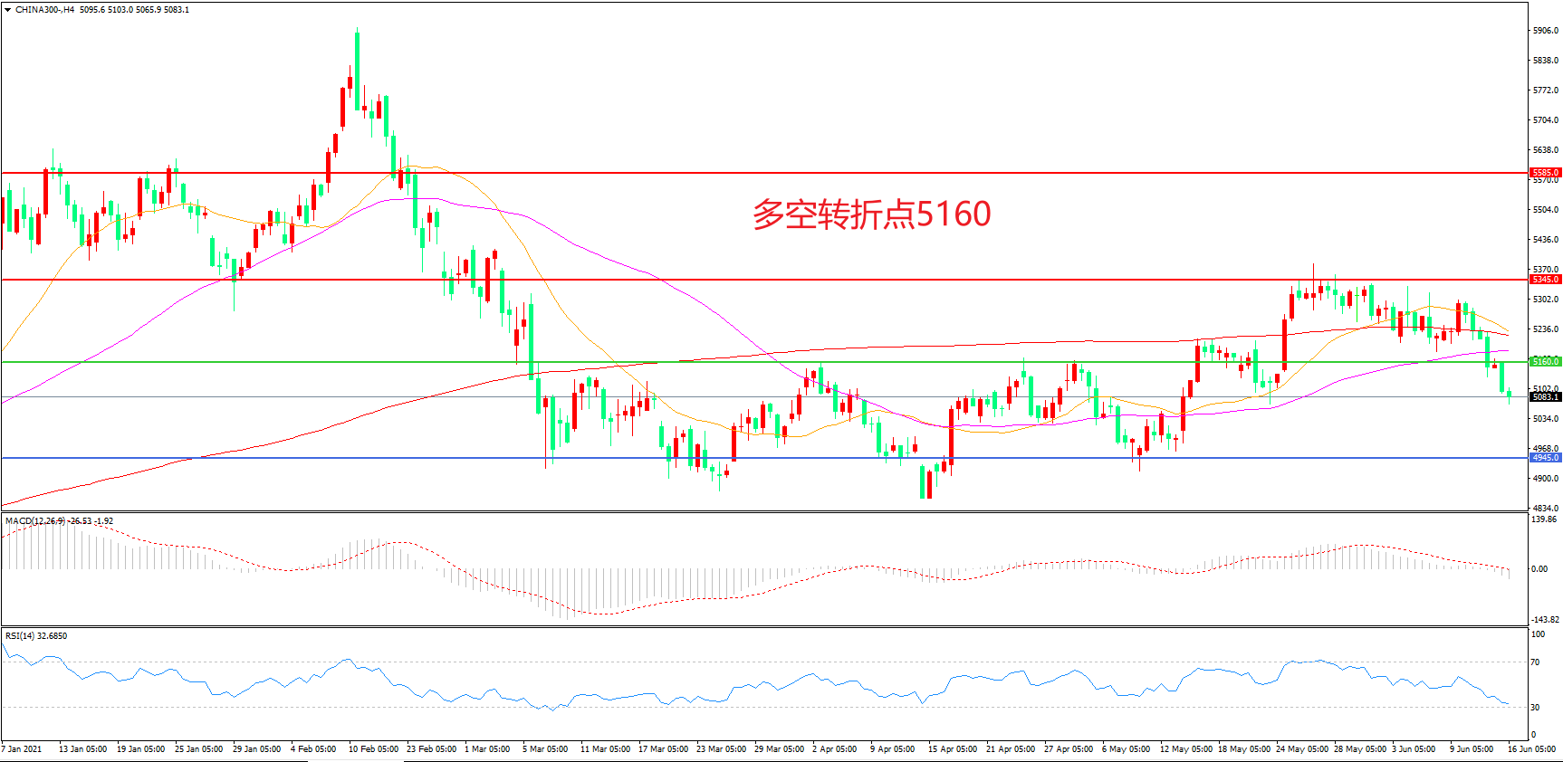 4小时图看,沪深300长阴下破,跌破前期整理区间,均线系统粘合成为上方阻力,MACD绿柱增加,RSI指标走平,日内震荡下行概率较大。