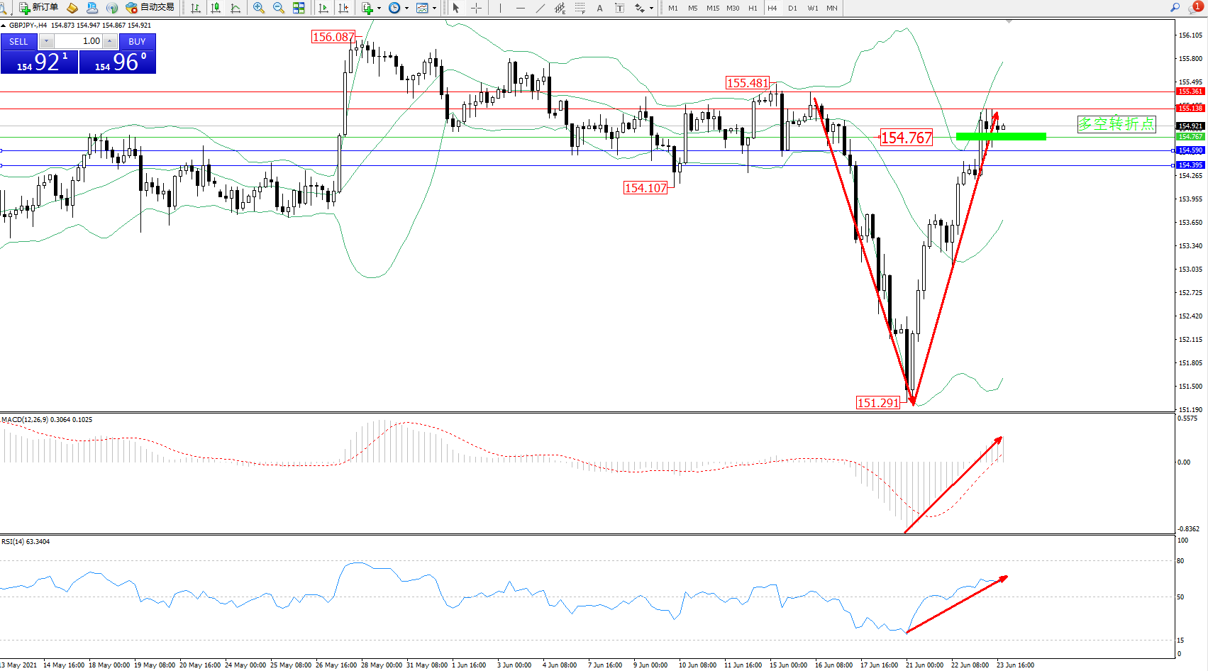 英镑兑日圆维持高位154.902附近震荡,英国政府决定将放松封锁措施的最后阶段推迟到7月19日,这可能会阻碍刚刚萌芽的经济复苏。英国央行本周四政策会议上有相当概率会跟进上周美联储的政策措辞,向市场透露未来的政策紧缩前景预期, 英国央行目前的经济预测存在上行风险,同意她的观点,即英国央行可能在2022年年中左右加息15个基点,然后在2023年再加息50个基点;未来几周英国央行任何暗示结束无薪休假的言论可能都不是问题,毕竟市场可能会进一步上调对2022年加息的预期。