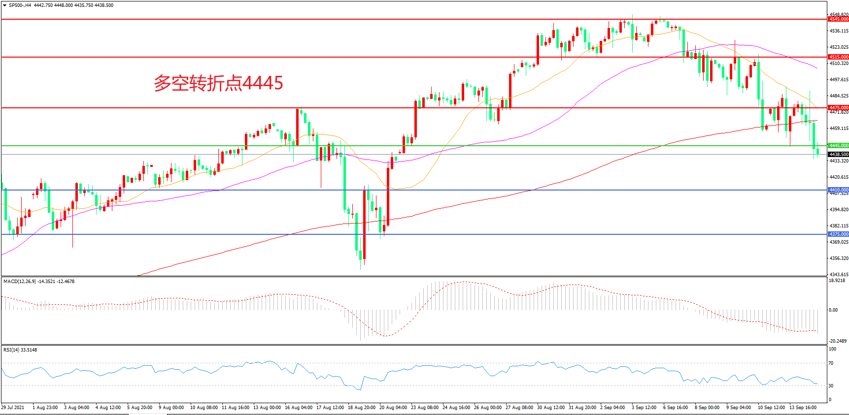 4小时图看,标普500长阴连续下破,短期走势低迷,21周期均线成为上方阻力,4410成为下方支撑, MACD绿柱增加,RSI指标走平,日内震荡下行概率较大。