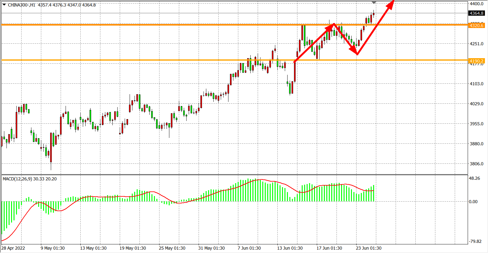 1小时图看,沪深300指数依靠4190强支撑运行,MACD在零轴之上呈现量能放大,目前突破4320一线后,阻力已转为支撑,日内在4320之上继续看涨为主,目标4450-4550
