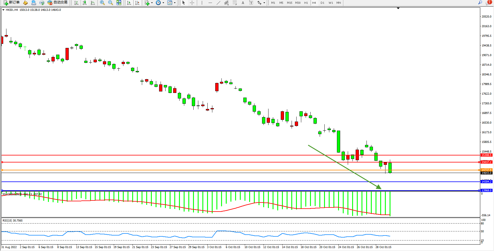 香港恒生指数10月31日(周一)收盘下跌176.04点,跌幅1.18%,报14687.02点;港股冲高回落,恒指、国指最终收跌1.18%及1.8%,恒生科技指数涨1.05%,盘中一度涨至5%,2900点得而复失。大型科技股纷纷冲高,收盘涨跌不一,腾讯、美团涨超2%,南下资金全天净买入港股52.14亿港元。