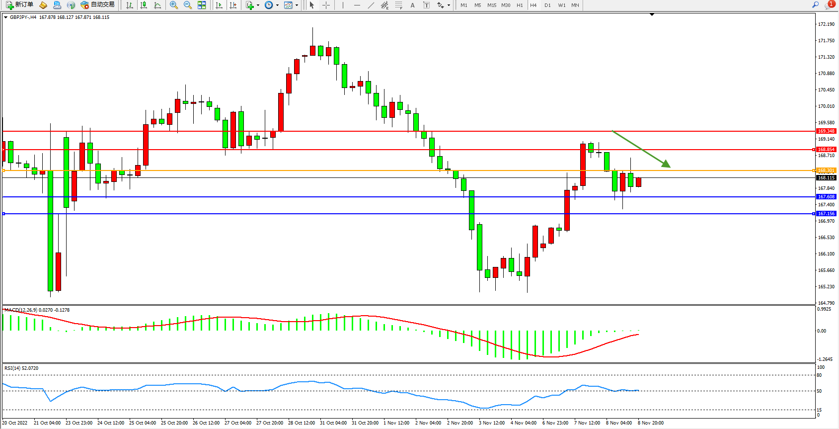 4小时图看:低位多头震荡上扬后,高位遇阻整理,空头动力有伺机入场迹象,MACD指标处于0轴线附近徘徊,RSI指标处于50均衡线附近弱势整理;
