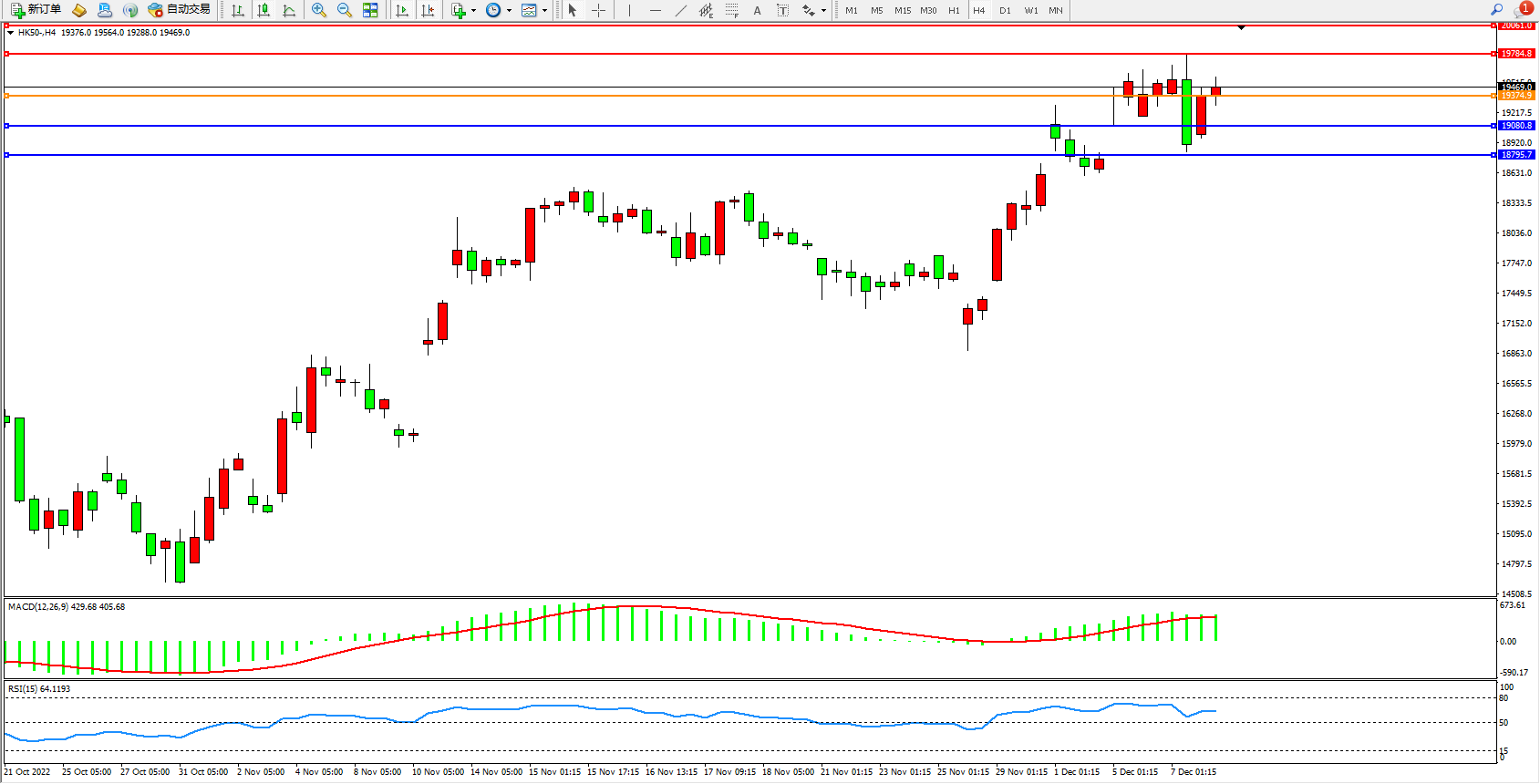 香港恒生指数12月8日(周四)收盘上涨635.41点,涨幅3.38%,报19450.23点;内地持续优化防控措施,市场做多情绪高涨,港股再现暴涨行情,恒生科技指数尾盘一度涨至7%,最终收涨6.64%,恒指、国指均大涨超3.3%,恒指重回19000整数关。治疗新冠常用药参考表发布,互联网医疗股、药品股、生物科技股大涨居前,南下资金全日净流入28.43亿港元,大市成交额为1606亿港元。