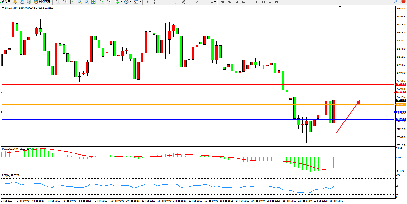 日经225指数2月22日(周三)收盘下跌360.60点,跌幅1.31%,报27112.50点。昨日周四东京证券交易所天皇诞辰,休市一日。日本央行委员田村直树:未来某个时候需要重新审查现在的政策,现在继续实行宽松政策是合适的,将需要更多时间来衡量日本央行迄今采取的措施对市场功能的影响,我们现在所处的阶段需要仔细观察日本是否会实现工资-物价螺旋上涨的良性循环。