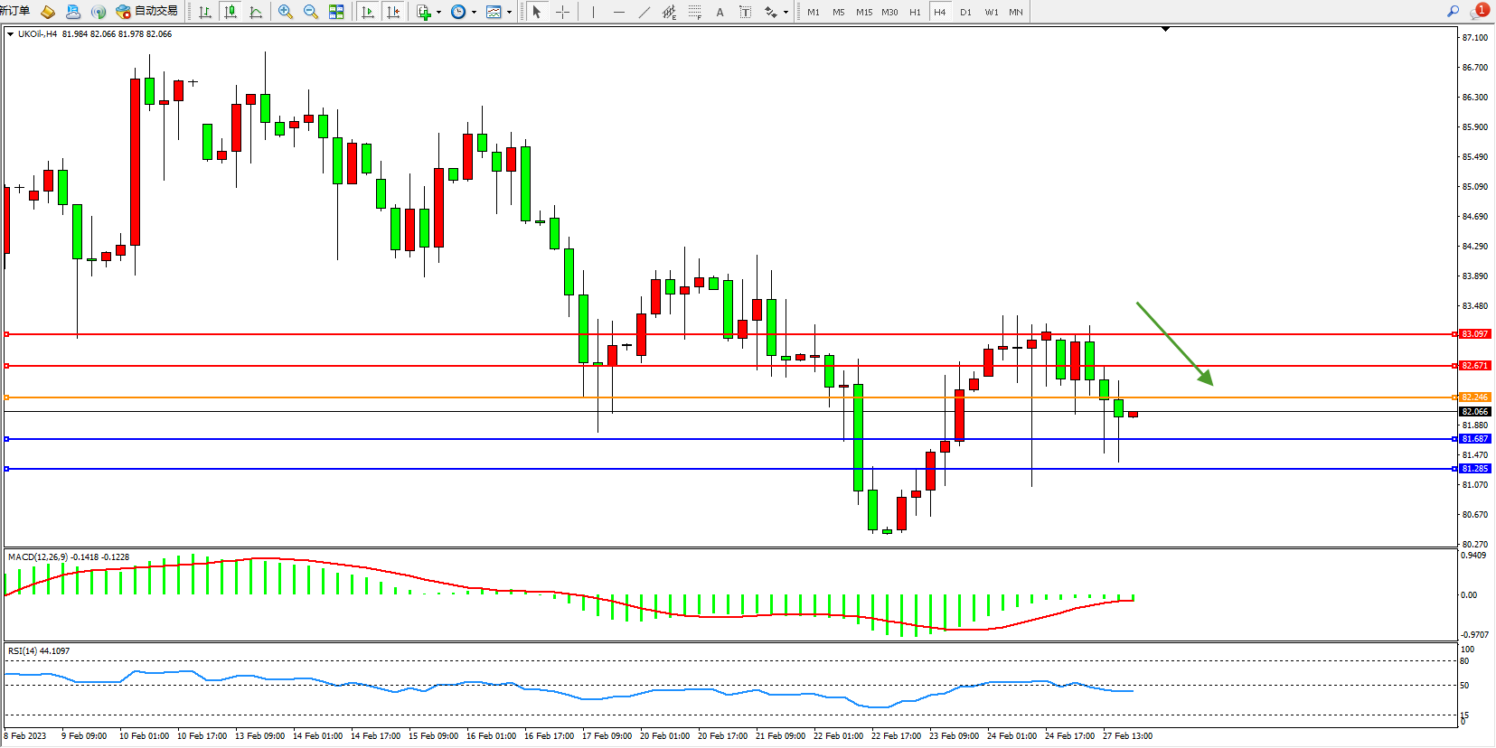 4小时图看:空头持续下移,短期跌势或将持续,市场空头跌势持续,MACD指标处于0轴线下侧徘徊,RSI指标处于50均衡线下侧整理;