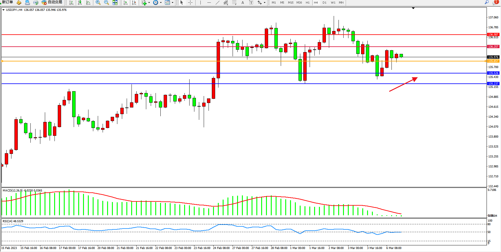 备选策略:135.857下方看跌,目标135.526 135.237