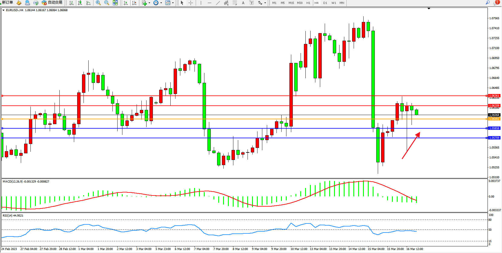 4小时图看:低位短期震荡上移,市场多头动力有伺机入场向上拉升迹象,但市场整体依旧受压制,MACD指标处于0轴线下侧徘徊,RSI指标处于50均衡线下侧整理;