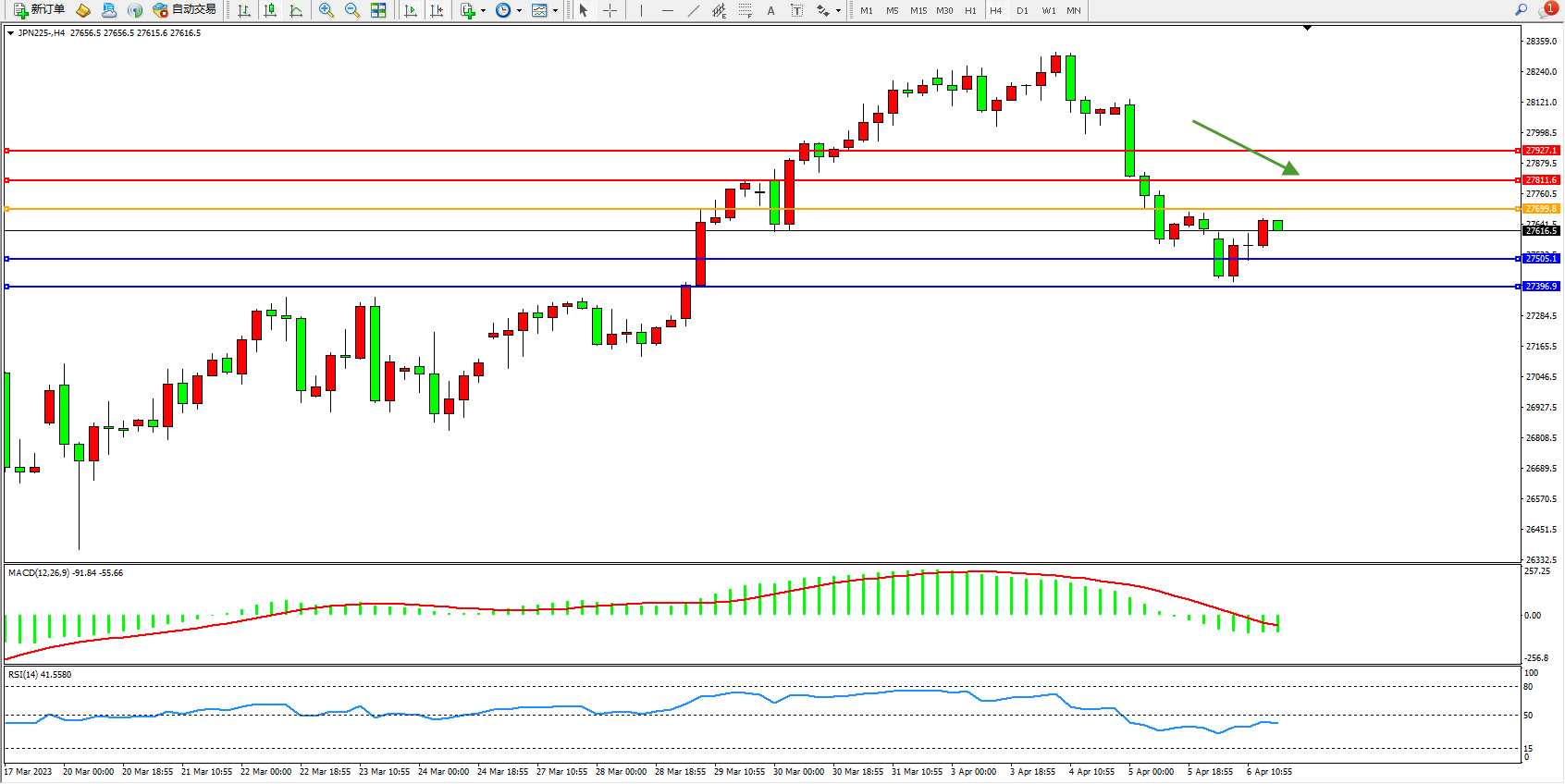 日经225指数4月6日(周四)收盘下跌336.76点,跌幅1.21%,报27476.50点。日本央行行长黑田东彦:日本经济不再处于通缩状态。物价稳定是日本央行的最大职责,消灭通缩至关重要。日本经济正朝着可持续的增长方向取得进展。