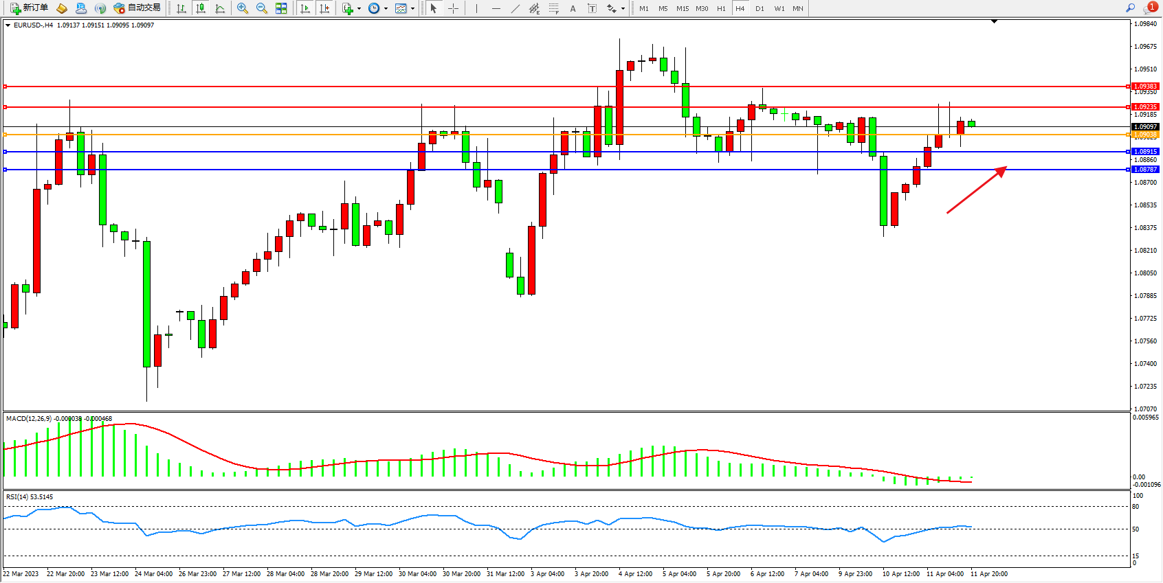 欧元美元EURUSD—4小时K线图显示: