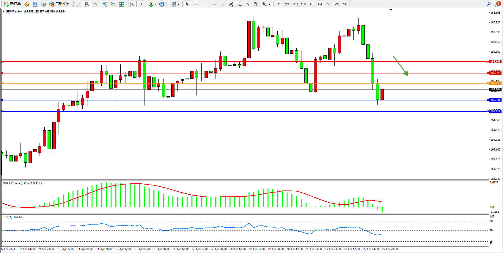 4小时图看:高位空头动力持续下挫,短期跌势或将延续,市场整体处于空头趋势中,MACD指标震荡下移至0轴线下侧徘徊,RSI指标处于50均衡线下侧弱势整理;