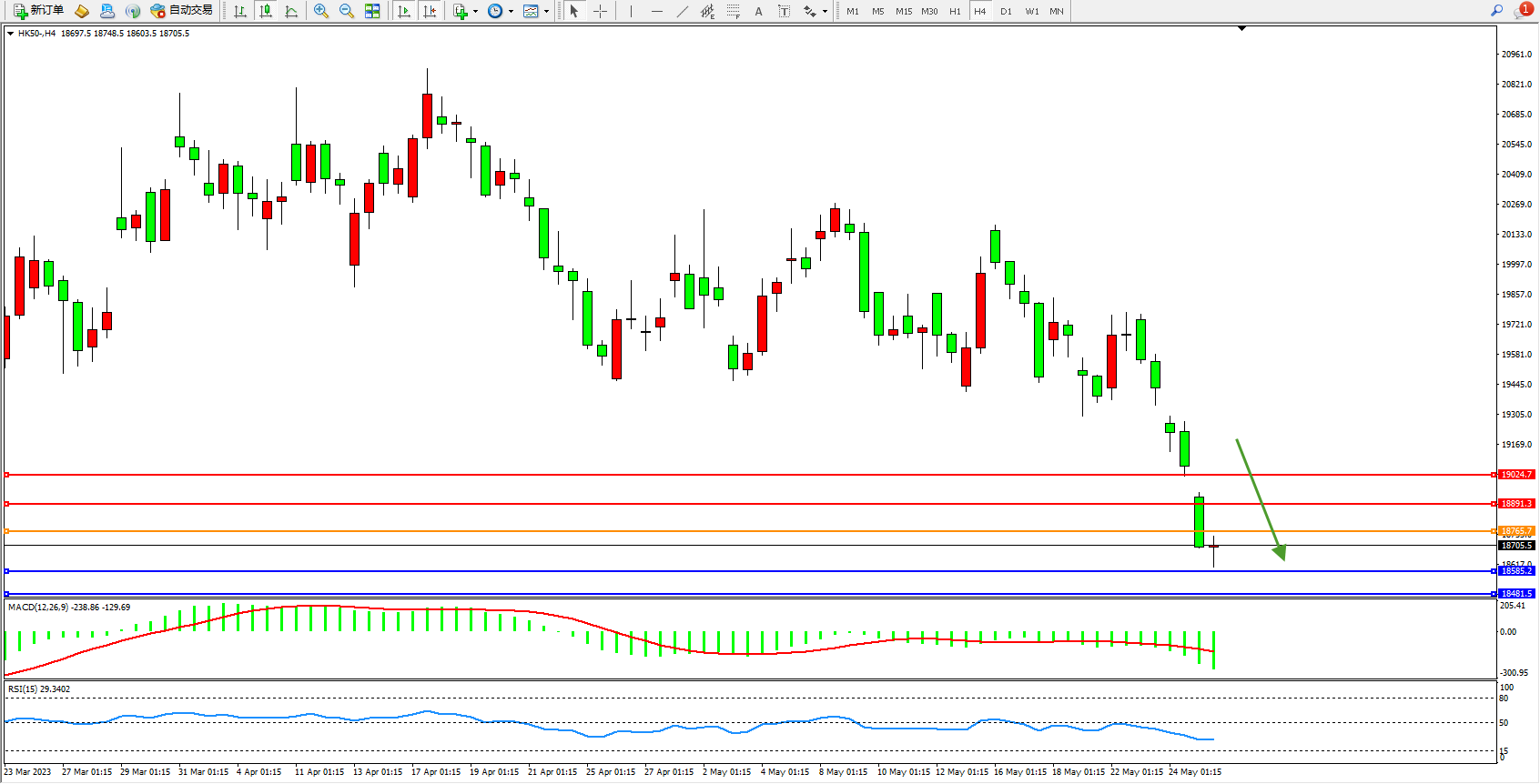 香港恒生指数5月25日(周四)收盘下跌369.01点,跌幅1.93%,报18746.92点;市场担忧美国债务上限谈判,惠誉把美国评级列负面观察名单,风险市场持续表现谨慎。港股三大指数全天维持大跌行情,恒指跌1.93%,国指、恒生科技指数分别下跌2.23%及2.25%,三者皆创5个月低价。权重科技股、大金融股、中字头股全线萎靡,大市承压十分明显,京东、美团、腾讯均跌超3%,南下资金全日逆势大幅净流入83.65亿港元,大市成交额为1155亿港元。