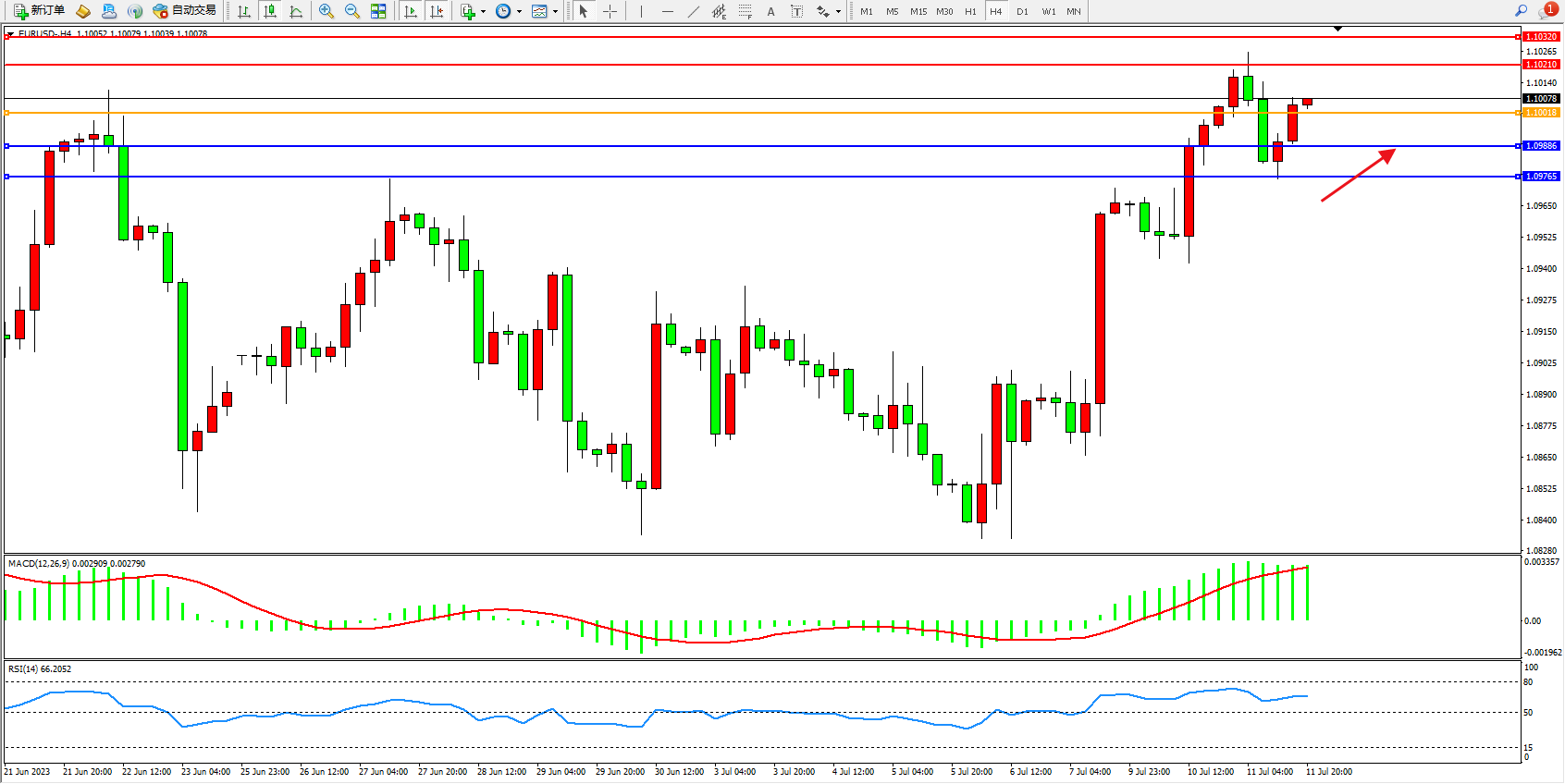 欧元兑美元维持1.10078附近震荡,欧洲央行关于通货膨胀的好消息。食品通胀应会在2023年下半年放缓。欧洲央行利率接近高点,然后会高位持稳。欧洲央行将需要在终端利率水平维持足够长的时间。