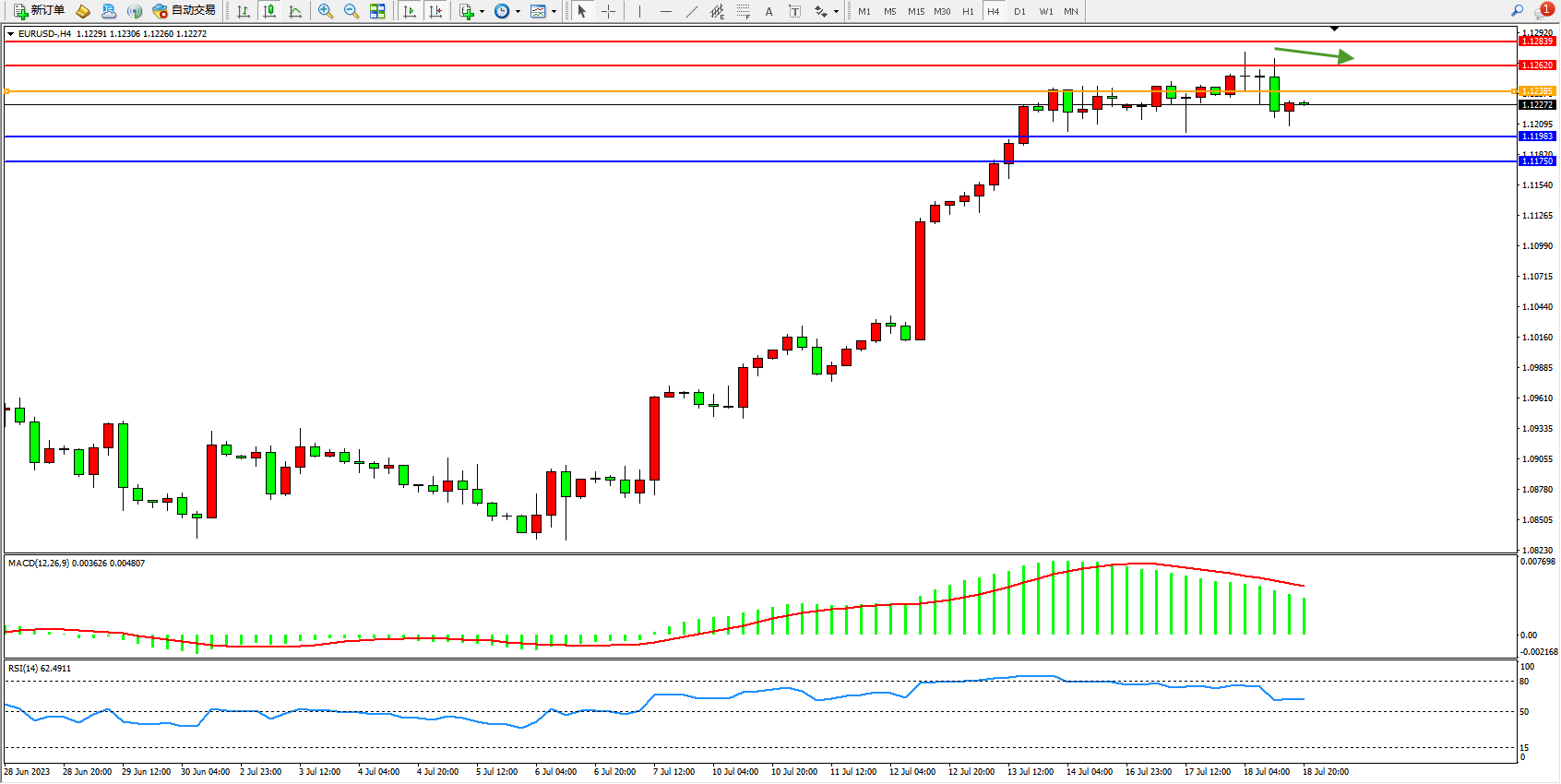 欧元美元EURUSD—4小时K线图显示: