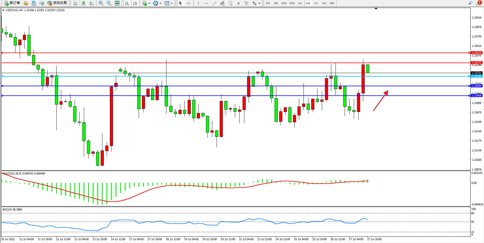 4小时图看:多头动力急速拉升,市场看涨情绪笼罩,短期有继续向上移动迹象,MACD指标处于0轴线上側弱势徘徊,RSI指标处于50均衡线上側弱势震荡;