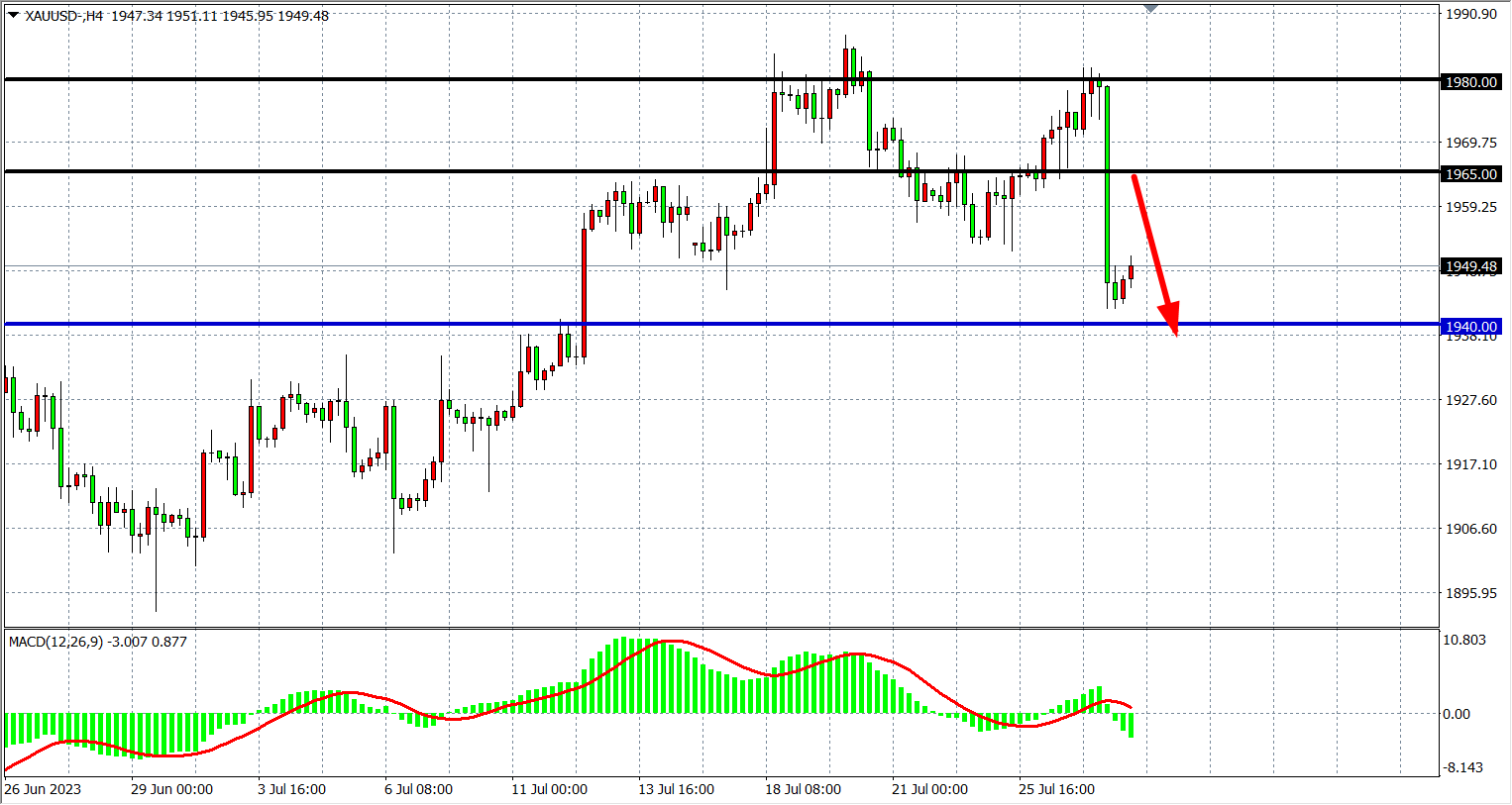 周四(7月27日)美国二季度GDP意外加速增长,美指止跌反弹,现货黄金一度跌至1940美元附近