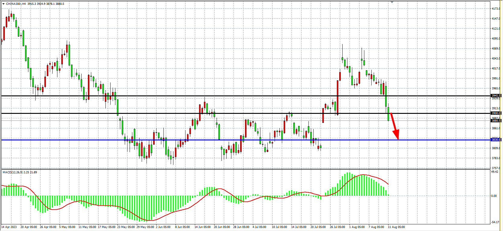 4小时图看,沪深300加速跌破3900关口,MACD量能即将下穿零轴,压力关注3900-3945附近,下方支撑看3830-3800附近。