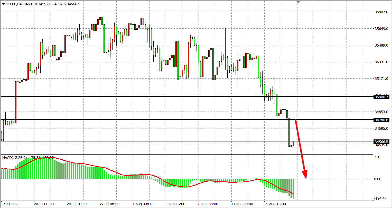 4小时图看,道指延续跌势,再度跌至34500附近,MACD在零轴下继续放量,行情延续空头,阻力关注34780-35000。