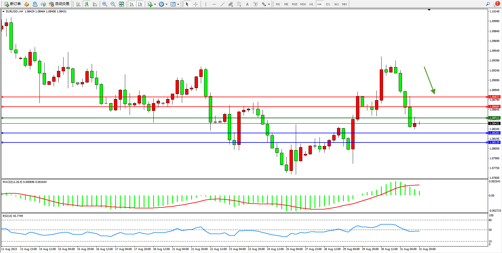 欧元美元EURUSD—4小时K线图显示: