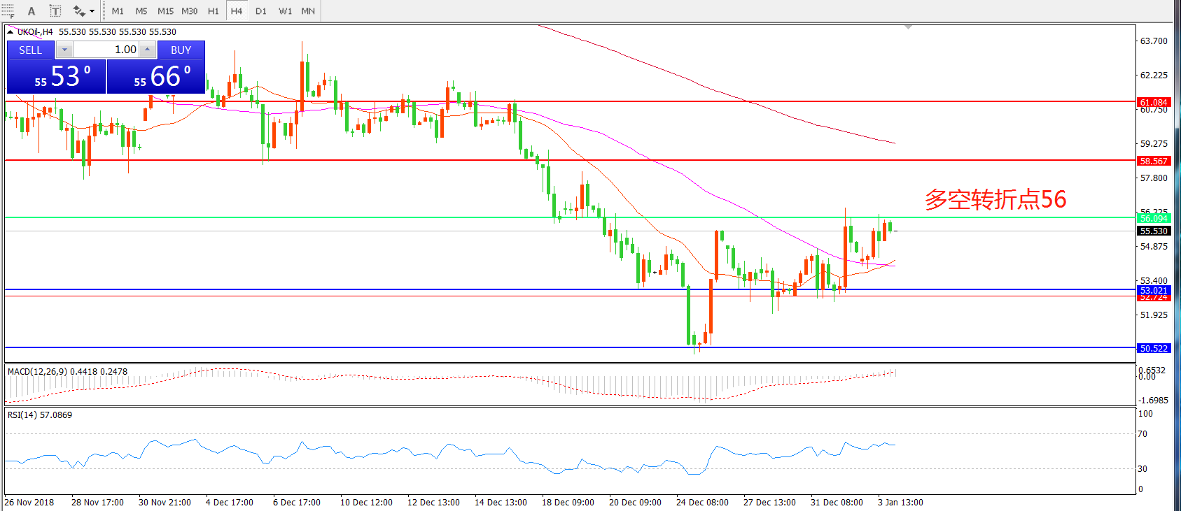 4小时图看,油价经过连续测试,站稳53美金一线支撑,目前整理上冲56美元阻力,21与55均线逐渐粘合形成支撑,MACD绿柱缩短,短期反弹有可能,箱体震荡的走势的概率较大。