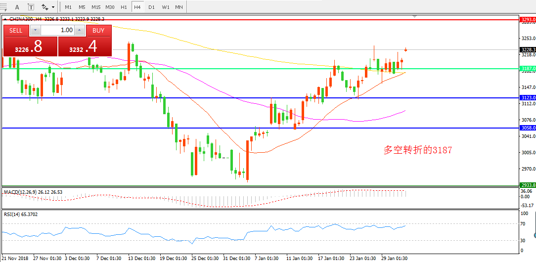 4小时图看,CHINA300中华指数经过整理突破并站稳200周期均线,整体价位依然在多空转折点之上。短期均线逐渐拐头, MACD红柱减少,暂时仍保持偏多思路。