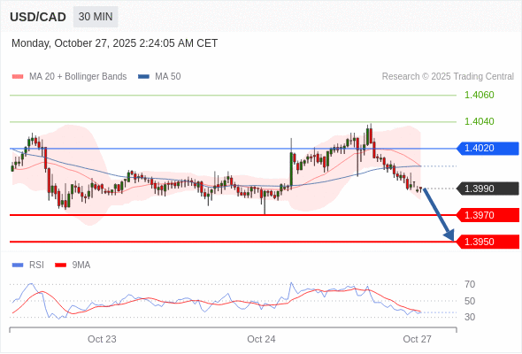 在 1.4020 之下,看跌,目标价位为 1.3970 ,然后为 1.3950 。
