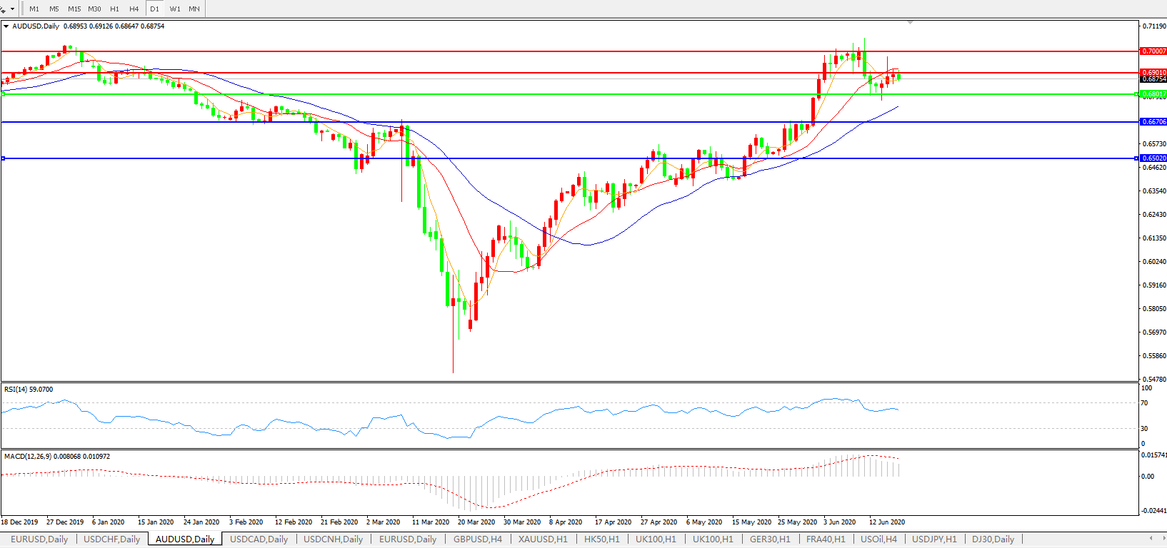 交易策略:0.6800上方看涨,目标0.6900、0.7000