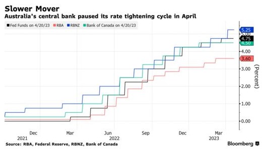 就目前来看,澳大利亚的通胀轨迹与美国和新西兰等经济体相似,美国和新西兰的物价涨速均在3月份有所放缓。目前市场普遍预计美联储将在即将到来的5月2-3日会议上加息25个基点,不过有一些官员表示,他们希望在某个时候暂停加息。