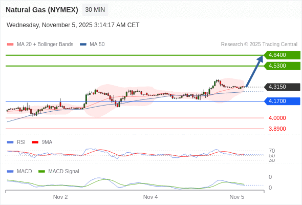 Natural Gas (NYMEX) (DEC5) 当日内: 看涨,当 4.1700 为支撑位,目标定在4.6400。